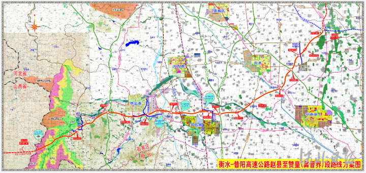 衡水-昔陽高速公路趙縣至贊皇(冀晉界)段起于趙縣謝莊鎮(zhèn)小郝莊村北,與在建的石衡高速公路相接,路線途經(jīng)趙縣、高邑、贊皇三縣,終點(diǎn)位于贊皇縣虎寨口村西,與在建的山西省昔榆高速公路以隧道形式相接,總體呈東西走向。